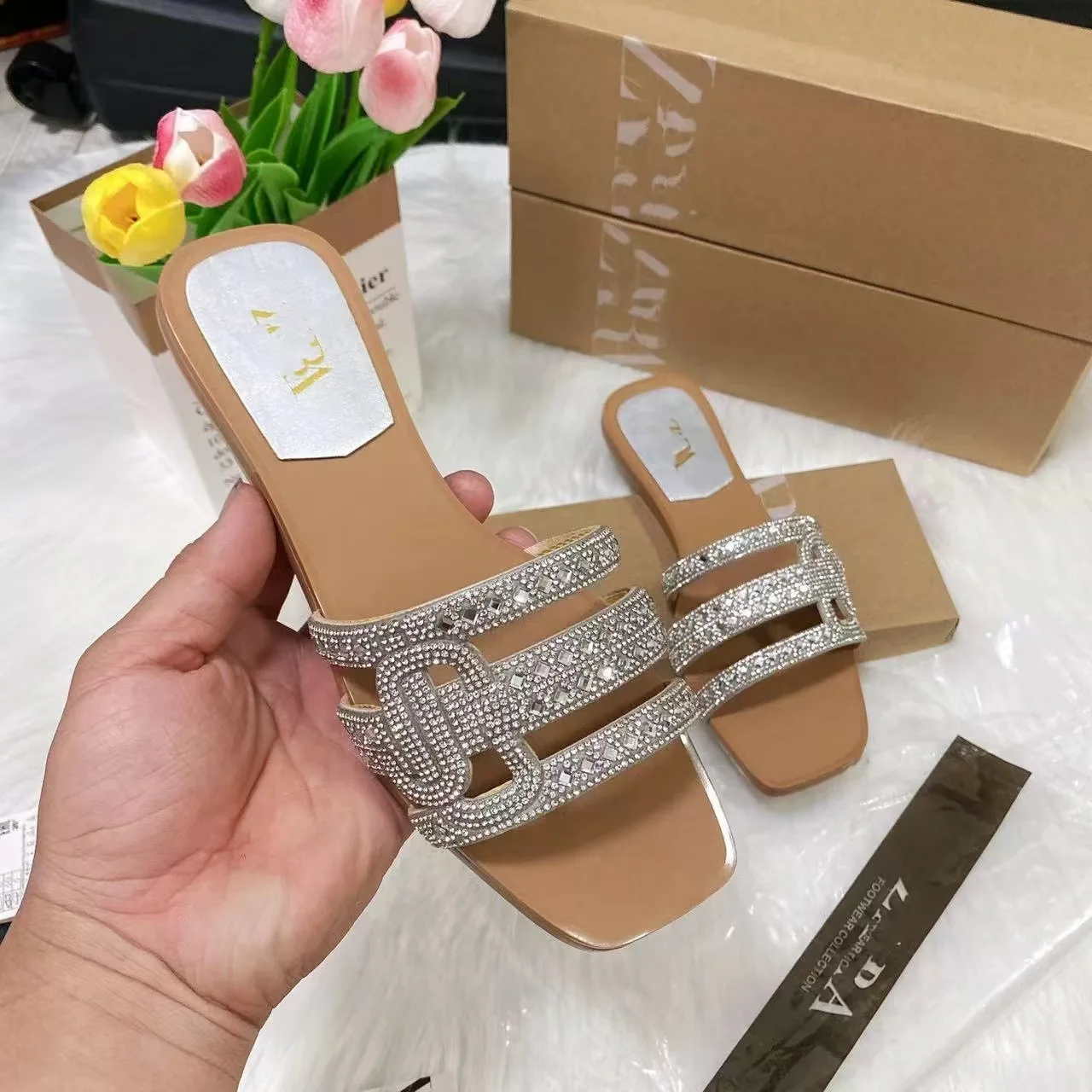 Cross-border European and American Style Fashion Rhinestone Decoration square Flat Large Size slippers